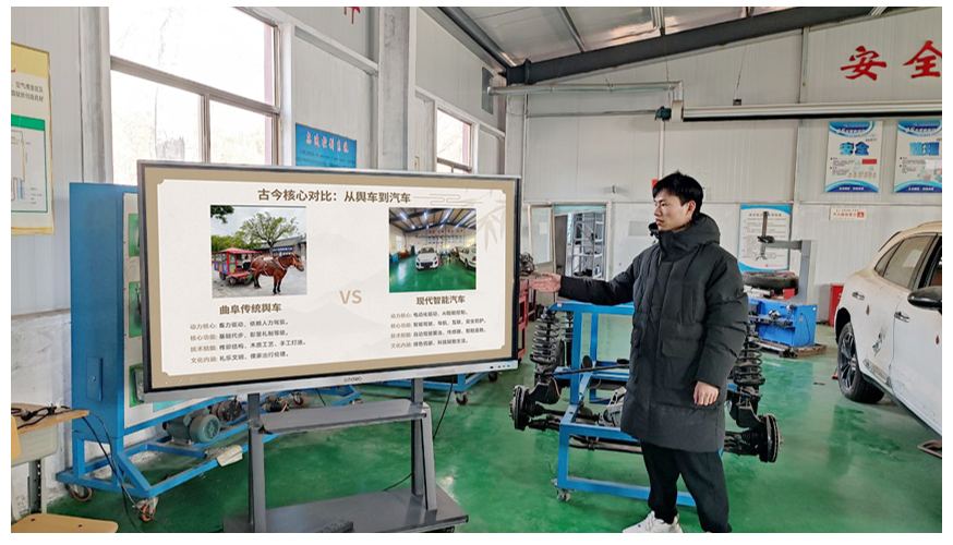 新能源汽车技术专业围绕“圣途智驱演进”,以“圣途载道・智驱未来”为核心展开展演。从孔子周游列国的舆车说起,追溯曲阜“行”文化的起源与流变,打造“传统交通工具与现代智能装备”的跨时空对话。骨干教师陈汝桐带领团队在学院汽车实训室,现场演示新能源汽车底盘智能检测技术,通过精密仪器实时呈现车辆运行数据;同时借助 AI 技术还原传统马车榫卯结构原理,通过自动化控制装置实现传统机械与现代电控的联动演示,让观众直观感受从“舆车代步”到“智驱出行”的技术革新,体会工匠精神在交通领域的传承与升华。